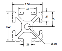 1" x 1" Grooved Tslot Extrusion Inch w/ .26" tslot, stick length 240 in.